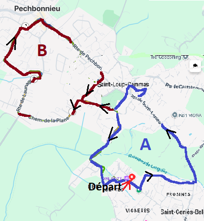 A : 4 km ; B : 8 km A & B Dos à la salle polyvalente, partir à droite. A 150 m tourner à gauche dans un chemin enherbé (Si trop d’humidité, on restera sur la route principale). Continuer tout droit jusqu’à une lisière de bois et partir à droite. On rejoint la D61 qu’on prend à gauche jusqu’à Saint Loup. A l’entrée du village, avant la cité nouvellement construite, prendre à droite un chemin goudronné qui monte sur 100 m. Tourner à Gauche, puis à droite (chemin de la Puntette). Au bout de la rue, tourner à gauche. Continuer sur le trottoir, traverser la rue principale pour prendre la rue du Treil, puis chemin de Gothis. A : Aller à gauche. Passer devant le nouveau cimetière. Descendre tout droit. Passer un petit pont et remonter vers la gauche jusqu’à la route. Tourner à gauche et encore à gauche : le parking est à 400 m. B : Continuer tout droit puis tourner à gauche sur route de Launaguet puis chemin de la plaine. A 1 km environ, prendre la route de droite et descendre vers Pechbonnieu. Entrer dans le lotissement « Mandela » que l’on traverse pour atteindre le chemin Panchaud. On arrive à une place arborée avec un beau lavoir et on remonte vers le village. A l’église, traverser la place et aller vers SAINT LOUP (couloir piéton protégé). Au village, prendre à gauche la route de Launaguet puis à droite vers le nouveau cimetière et suivez le trajet décrit en A. |